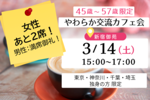 | 参加条件 | 東京・神奈川・千葉・埼玉にお住まい・ お仕事をされている45歳~57歳までの独身の方 |